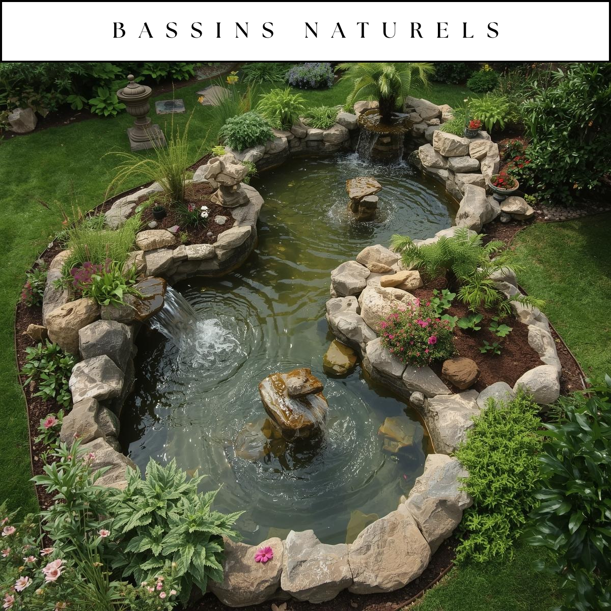 Un jardin avec un étang de pierre entouré de plantes, fleurs et verdure, et une petite cascade.