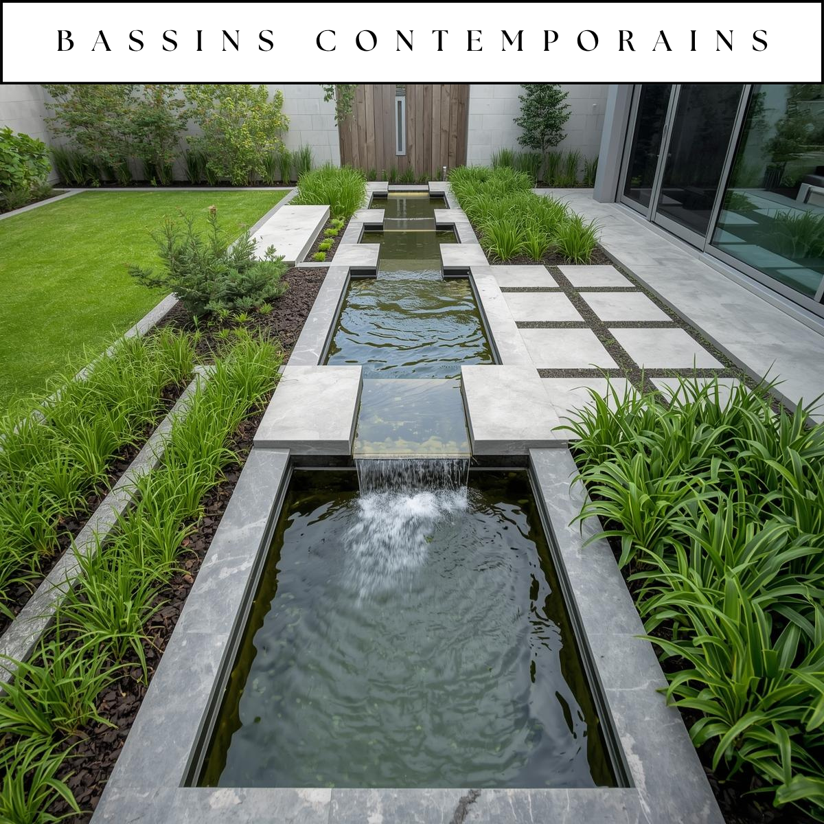 Jardin contemporain avec une fontaine en série, plantes vertes et surface de terrasse en pavés.